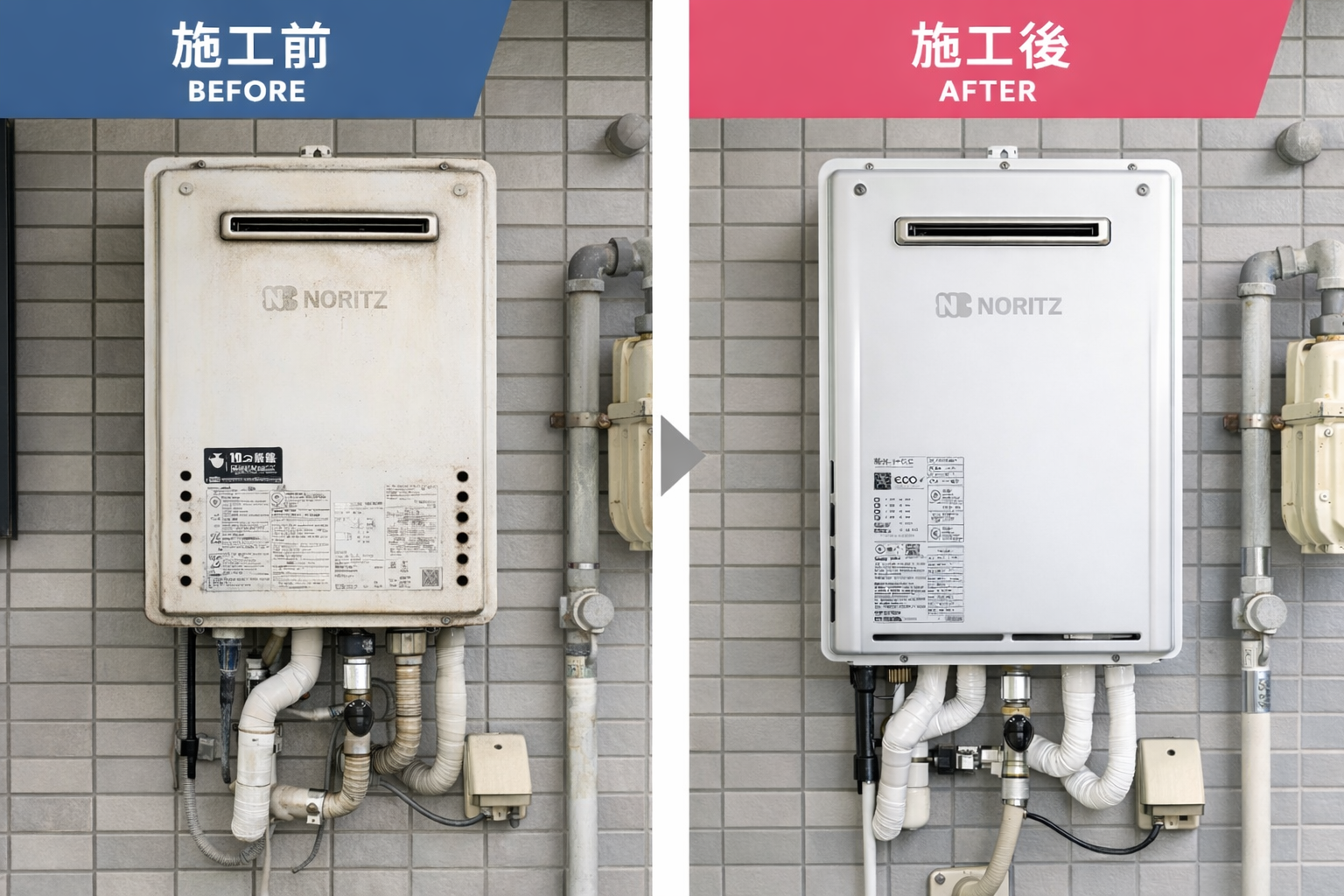 経年劣化によるトラブルを防ぐため、ノーリツ製24号給湯器へ交換を行いました。